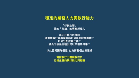 穩定的業務人力與執行能力 「行銷主管」 是的「代銷」的專案經理人 真正在執行目標時 這考驗著行銷專案幹部如何長期統整團隊? 如何分配成員任務? 統合之後是否端出可以交差的成果? 以此證明團隊價值 也支撐整個企業達標 貫徹執行力關鍵就在於 行銷主管的執行能力與經驗