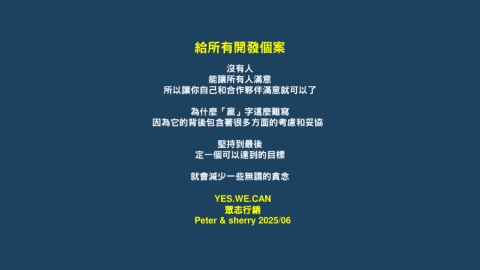 給所有開發個案 沒有人 能讓所有人滿意 所以讓你自己和合作夥伴滿意就可以了 為什麼「贏」字這麼難寫 因為它的背後包含著很多方面的考慮和妥協 堅持到最後 定一個可以達到的目標 就會減少一些無謂的貪念 YES.WE.CAN 眾志行銷 Peter & sherry 2025/06