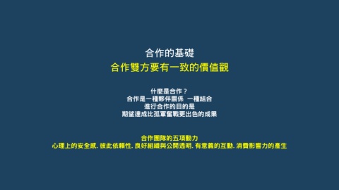 合作的基礎 合作雙方要有一致的價值觀 什麼是合作? 合作是一種夥伴關係 一種結合 進行合作的目的是 期望達成比孤軍奮戰更出色的成果 合作團隊的五項動力 心理上的安全感.彼此依賴性.良好組織與公開透明.有意義的互動.消費影響力的產生