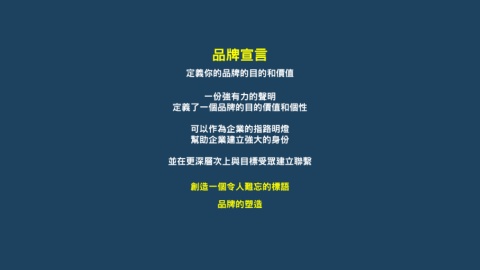 品牌宣言 定義你的品牌的目的和價值 一份強有力的聲明 定義了一個品牌的目的價值和個性 可以作為企業的指路明燈 幫助企業建立強大的身份 並在更深層次上與目標受眾建立聯繫 創造一個令人難忘的標語 品牌的塑造