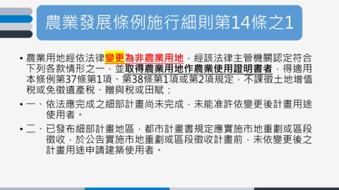 農業發展條例施行細則第14條之1 • 農業用地經依法律變更為非農業用地,經該法律主管機關認定符合 下列各款情形之一,並取得農業用地作農業使用證明書者,得適用 本條例第37條第1項、第38條第1項或第2項規定,不課徵土地增值 稅或免徵遺產稅、贈與稅或田賦: • 一、依法應完成之細部計畫尚未完成,未能准許依變更後計畫用途 使用者。 • 二、已發布細部計畫地區,都市計畫書規定應實施市地重劃或區段 徵收,於公告實施市地重劃或區段徵收計畫前,未依變更後之 計畫用途申請建築使用者。