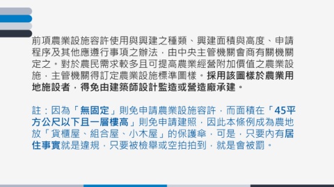 前項農業設施容許使用與興建之種類、興建面積與高度、申請 程序及其他應遵行事項之辦法,由中央主管機關會商有關機關 定之。對於農民需求較多且可提高農業經營附加價值之農業設 施,主管機關得訂定農業設施標準圖樣。採用該圖樣於農業用 地施設者,得免由建築師設計監造或營造廠承建。 註:因為「無固定」則免申請農業設施容許,而面積在「45平 方公尺以下且一層樓高」則免申請建照,因此本條例成為農地 放「貨櫃屋、組合屋、小木屋」的保護傘,可是,只要內有居 住事實就是違規,只要被檢舉或空拍拍到,就是會被罰。