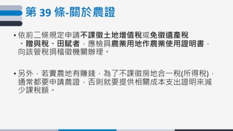 第 39 條-關於農證 • 依前二條規定申請不課徵土地增值稅或免徵遺產稅 、贈與稅、田賦者,應檢具農業用地作農業使用證明書, 向該管稅捐稽徵機關辦理。 • 另外,若賣農地有賺錢,為了不課徵房地合一稅(所得稅), 通常都要申請農證,否則就要提供相關成本支出證明來減 少課稅額。