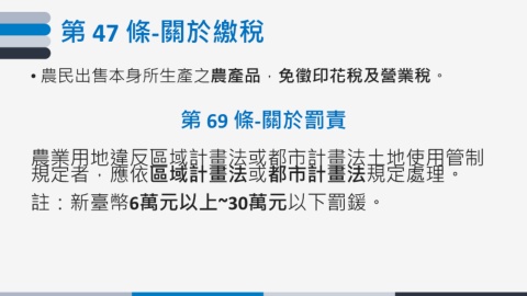 第 47 條-關於繳稅 • 農民出售本身所生產之農產品,免徵印花稅及營業稅。 第 69 條-關於罰責 農業用地違反區域計畫法或都市計畫法土地使用管制 規定者,應依區域計畫法或都市計畫法規定處理。 註:新臺幣6萬元以上~30萬元以下罰鍰。