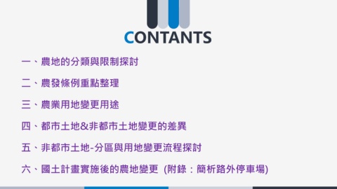 CONTANTS 一、農地的分類與限制探討 二、農發條例重點整理 三、農業用地變更用途 四、都市土地&非都市土地變更的差異 五、非都市土地-分區與用地變更流程探討 六、國土計畫實施後的農地變更 (附錄:簡析路外停車場)