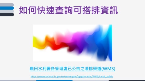 如何快速查詢可搭排資訊 農田水利署各管理處已公告之灌排渠道(WMS) https://www.iacloud.ia.gov.tw/servergate/sgsgate.ashx/WMS/canal_public