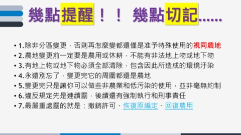 幾點提醒!! 幾點切記…… • 1.除非分區變更,否則再怎麼變都還僅是准予特殊使用的視同農地 • 2.農地變更前一定要是農用或休耕,不能有非法地上物或地下物 • 3.有地上物或地下物必須全部清除,包含因此所造成的環境汙染 • 4.永遠別忘了,變更完它的周圍都還是農地 • 5.變更完只是讓你可以做些非農業和低污染的使用,並非毫無約制 • 6.違反規定先是連續罰,後續還有強制執行和刑事責任 • 7.最嚴重處罰的就是:撤銷許可、恢復原編定、回復農用
