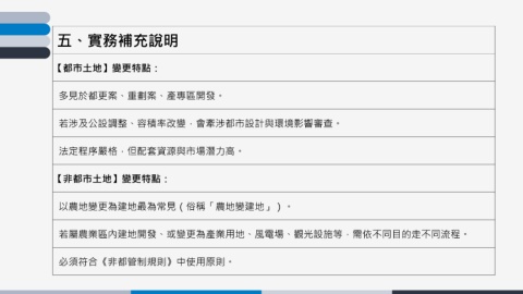 五、實務補充說明 【都市土地】變更特點: 多見於都更案、重劃案、產專區開發。 若涉及公設調整、容積率改變,會牽涉都市設計與環境影響審查。 法定程序嚴格,但配套資源與市場潛力高。 【非都市土地】變更特點: 以農地變更為建地最為常見(俗稱「農地變建地」)。 若屬農業區內建地開發、或變更為產業用地、風電場、觀光設施等,需依不同目的走不同流程。 必須符合《非都管制規則》中使用原則。