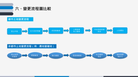 六、變更流程圖比較 都市土地變更流程 公開展覽 內政部都委會 提出申請 地方政府預審 都委會審議 與公聽會 核定 公告實施 非都市土地變更流程(例:農地變建地) 提出使用 鄉鎮審查 聯合審查 區委會審議 地目變更 建照與開 地變更 登記 發許可