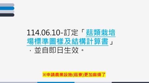114.06.10-訂定「菇類栽培 場標準圖樣及結構計算書」 ,並自即日生效。 ※申請農業設施(菇寮)更加麻煩了