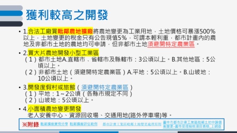 • 1.合法工廠買毗鄰農地擴廠將農地變更為工業用地,土地價格可暴漲500%