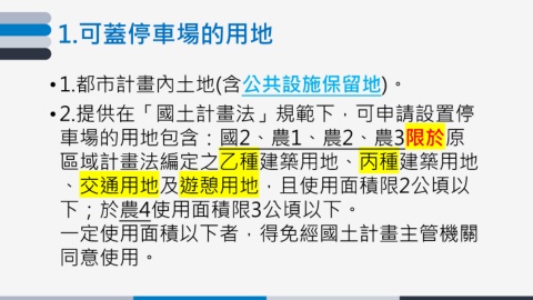 1.可蓋停車場的用地 •1.都市計畫內土地(含公共設施保留地)。 •2.提供在「國土計畫法」規範下,可申請設置停 車場的用地包含:國2、農1、農2、農3限於原 區域計畫法編定之乙種建築用地、丙種建築用地 、交通用地及遊憩用地,且使用面積限2公頃以 下;於農4使用面積限3公頃以下。 一定使用面積以下者,得免經國土計畫主管機關 同意使用。