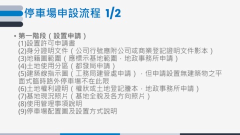 停車場申設流程 1/2 • 第一階段(設置申請) (1)設置許可申請書 (2)身分證明文件(公司行號應附公司或商業登記證明文件影本) (3)地籍圖範圍(應標示基地範圍,地政事務所申請) (4)土地使用分區(都發局申請) (5)建築線指示圖(工務局建管處申請),但申請設置無建築物之平 面式臨時路外停車場不在此限 (6)土地權利證明(權狀或土地登記謄本,地政事務所申請) (7)基地現況照片(基地全貌及各方向照片) (8)使用管理事項說明 (9)停車場配置圖及設置方式說明