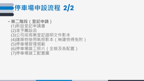 停車場申設流程 2/2 • 第二階段(登記申請) (1)新設登記申請書 (2)准予籌設函 (3)公司或商業登記證明文件影本 (4)建築物使用執照影本(無建物得免附) (5)停車場管理規範 (6)停車場竣工照片(全貌及各配置) (7)停車場竣工配置圖