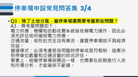 停車場申設常見問答集 3/4 • Q3:除了土地分區,蓋停車場還需要考量那些問題? A3:需考量問題如下: 電力供應:柵欄和自動收費系統皆依賴電力運作,因此必 須先評估如何確保電力供應。 交通流量:若附近完全沒有車流,建置停車場就不具經濟 效益。 營運模式:必須考慮是採用臨時停車或是月租制,這牽涉 到停車位數量和交通流量的綜合評估。 事實上,經營停車場與開店一樣,也需要在前期進行人流 和市場分析,才能確保不虧損。