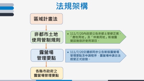法規架構 區域計畫法 非都市土地 ● 111/7/20內政部公告非都土管修正案, 使用管制規則 「農牧用地」及「林業用地」新增露 營設施容許使用項目。 露營場 ● 111/7/20交通部同步公告新版露營場 管理要點 管理要點及申請程序,露營場申請合法 經營正式啟動。 各縣市政府之 露營場管理要點