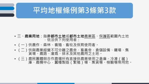 平均地權條例第3條第3款 • 三、農業用地:指非都市土地或都市土地農業區、保護區範圍內土地 ,依法供下列使用者: • (一)供農作、森林、養殖、畜牧及保育使用者。 • (二)供與農業經營不可分離之農舍、畜禽舍、倉儲設備、曬場、集 貨場、農路、灌溉、排水及其他農用之土地。 • (三)農民團體與合作農場所有直接供農業使用之倉庫、冷凍(藏) 庫、農機中心,蠶種製造(繁殖)場、集貨場、檢驗場等用地。