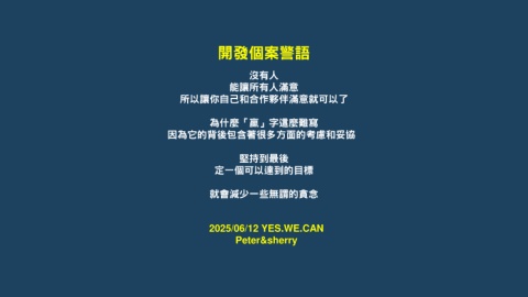 開發個案警語 沒有人 能讓所有人滿意 所以讓你自己和合作夥伴滿意就可以了 為什麼「贏」字這麼難寫 因為它的背後包含著很多方面的考慮和妥協 堅持到最後 定一個可以達到的目標 就會減少一些無謂的貪念 2025/06/12 YES.WE.CAN Peter&sherry