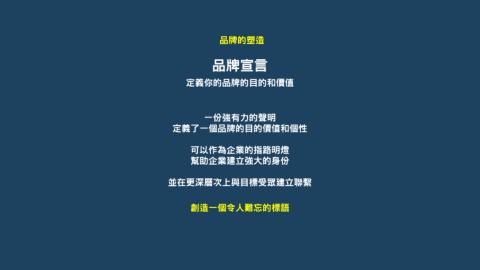品牌的塑造 品牌宣言 定義你的品牌的目的和價值 一份強有力的聲明 定義了一個品牌的目的價值和個性 可以作為企業的指路明燈 幫助企業建立強大的身份 並在更深層次上與目標受眾建立聯繫 創造一個令人難忘的標語