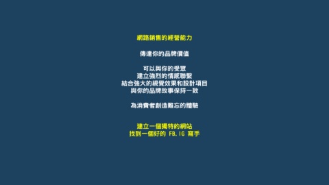 網路銷售的經營能力 傳達你的品牌價值 可以與你的受眾 建立強烈的情感聯繫 結合強大的視覺效果和設計項目 與你的品牌故事保持一致 為消費者創造難忘的體驗 建立一個獨特的網站 找到一個好的 FB.IG 寫手