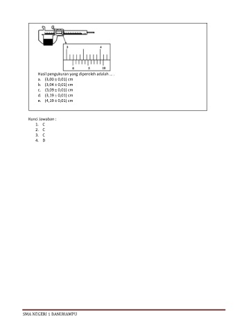 Hasil pengukuran yang diperoleh adalah … . a. (3,00 ± 0,01) cm b. (3,04 ± 0,01) cm c. (3,09 ± 0,01) cm d. (3,19 ± 0,01) cm e. (4,19 ± 0,01) cm Kunci Jawaban : 1. C 2. C 3. C 4. D SMA NEGERI 1 BANUHAMPU
