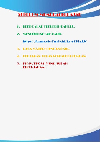 SEBELUM MEMULAI BELAJAR 1. BERDOALAH TERLEBIH DAHULU. 2. MENGISI DAFTAR HADIR https://forms.gle/FmPxkL3zyrCBixJJ6 3. BACA MATERI DENGAN BAIK. 4. KERJAKAN TUGAS SESUAI PERTEMUAN 5. KIRIM TUGAS YANG SUDAH DIKERJAKAN.