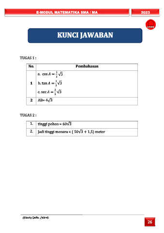 E-MODUL MATEMATIKA SMA / MA 2023 Kunci Jawaban KUNCI JAWABAN TUGAS 1 : No. Pembahasan 1 a. cos = √3 2 1 1 b. tan = √3 3 2 c. sec = √3 3 2 AB= 4√3 TUGAS 2 : 1. tinggi pohon = 60√3 2. Jadi tinggi menara = ( 50√3 + 1,5) meter Alhady Daffa Zuhrah