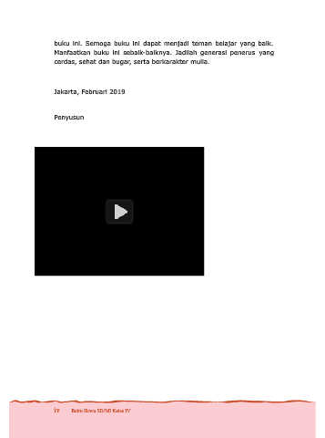 buku ini. Semoga buku ini dapat menjadi teman belajar yang baik. Manfaatkan buku ini sebaik-baiknya. Jadilah generasi penerus yang cerdas, sehat dan bugar, serta berkarakter mulia. Jakarta, Februari 2019 Penyusun iv Buku Siswa SD/MI Kelas IV