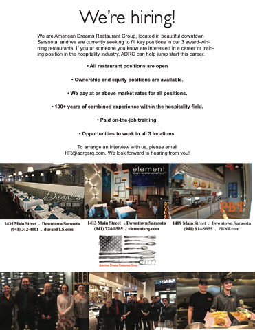 We are American Dreams Restaurant Group, located in beautiful downtown Sarasota, and we are currently seeking to fill key positions in our 3 award-win- ning restaurants. If you or someone you know are interested in a career or train- ing position in the hospitality industry, ADRG can help jump start this career.