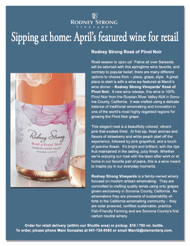 will be adorned with this springtime wine favorite, and contrary to popular belief, there are many different options to choose from – place, grape, style. A great place to start is with a wine we featured at March’s wine dinner – Rodney Strong Vineyards’ Rosé of Pinot Noir. A new wine release, this wine is 100% Pinot Noir from the Russian River Valley AVA in Sono- ma County, California. It was crafted using a delicate balance of traditional winemaking and innovation in one of the world’s most highly regarded regions for growing the Pinot Noir grape.
