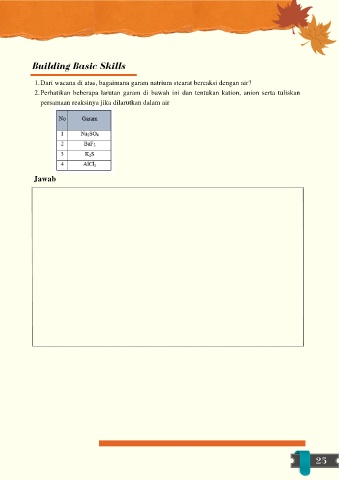 Building Basic Skills 1. Dari wacana di atas, bagaimana garam natrium stearat bereaksi dengan air? 2. Perhatikan beberapa larutan garam di bawah ini dan tentukan kation, anion serta tuliskan persamaan reaksinya jika dilarutkan dalam air Jawab 25
