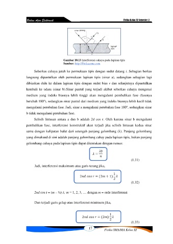 Gambar 10.13 Interferensi cahaya pada lapisan tipis