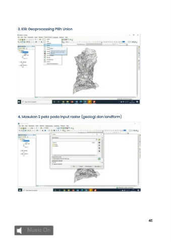 3. Klik Geoprocessing Pilih Union 4. Masukan 2 peta pada input raster (geologi dan landform) 45