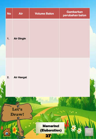 Gambarkan No Air Volume Balon perubahan balon 1. Air Dingin 2. Air Hangat Memerinci (Elaboration) 27
