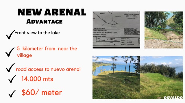 new arenal Advantage Front view to the lake 5 kilometer from near the village road access to nuevo arenal 14.000 mts $60/ meter osvaldo
