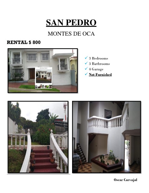 SAN PEDRO MONTES DE OCA RENTAL $ 800 ✓ 3 Bedrooms ✓ 3 Bathrooms ✓ 4 Garage ✓ Not Furnished Oscar Carvajal