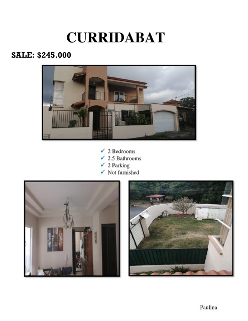 CURRIDABAT SALE: $245.000 ✓ 2 Bedrooms ✓ 2.5 Bathrooms ✓ 2 Parking ✓ Not furnished Paulina