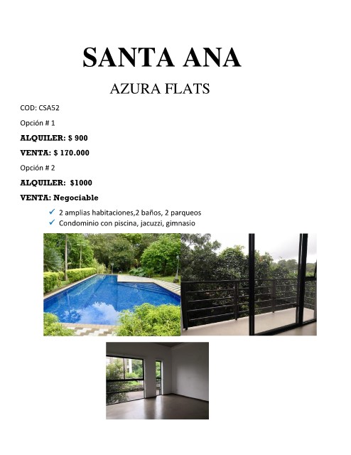 SANTA ANA AZURA FLATS COD: CSA52 Opción # 1 ALQUILER: $ 900 VENTA: $ 170.000 Opción # 2 ALQUILER: $1000 VENTA: Negociable ✓ 2 amplias habitaciones,2 baños, 2 parqueos ✓ Condominio con piscina, jacuzzi, gimnasio
