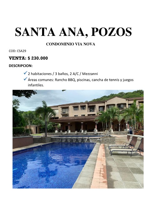SANTA ANA, POZOS CONDOMINIO VIA NOVA COD: CSA29 VENTA: $ 230.000 DESCRIPCION: ✓ 2 habitaciones / 3 baños, 2 A/C / Mezzanni ✓ Áreas comunes: Rancho BBQ, piscinas, cancha de tennis y juegos infantiles.