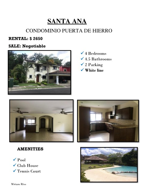 SANTA ANA CONDOMINIO PUERTA DE HIERRO RENTAL: $ 2650 SALE: Negotiable ✓ 4 Bedrooms ✓ 4.5 Bathrooms ✓ 2 Parking ✓ White line AMENITIES ✓ Pool ✓ Club House ✓ Tennis Court Miriam Ríos