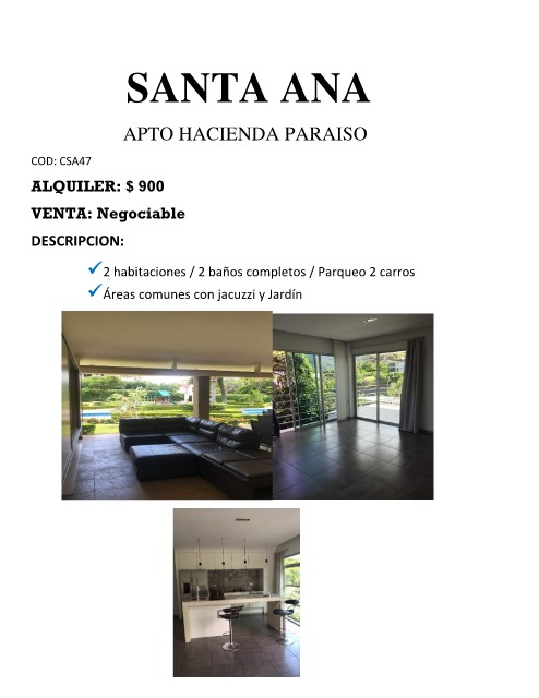 SANTA ANA APTO HACIENDA PARAISO COD: CSA47 ALQUILER: $ 900 VENTA: Negociable DESCRIPCION: ✓ 2 habitaciones / 2 baños completos / Parqueo 2 carros ✓ Áreas comunes con jacuzzi y Jardín