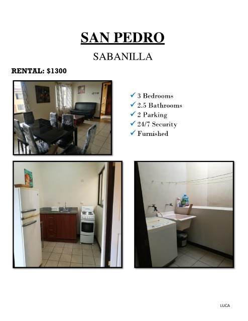 SAN PEDRO SABANILLA RENTAL: $1300 ✓ 3 Bedrooms ✓ 2.5 Bathrooms ✓ 2 Parking ✓ 24/7 Security ✓ Furnished LUCA