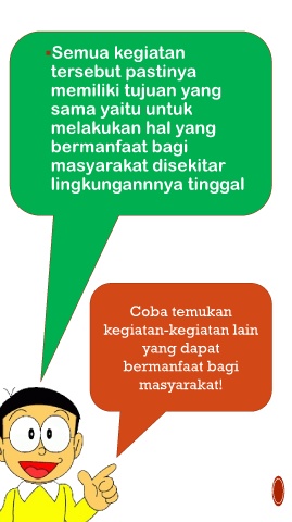 ▪Semua kegiatan tersebut pastinya memiliki tujuan yang sama yaitu untuk melakukan hal yang bermanfaat bagi masyarakat disekitar lingkungannnya tinggal Coba temukan kegiatan-kegiatan lain yang dapat bermanfaat bagi masyarakat!