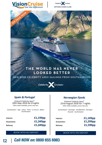 12 Call NOW on: 0800 655 6983 Spain & PortugalOnboard Celebrity Apex%u00ae29th May 2026 for 8 nightsOther dates available, prices may varySouthampton - Vigo - Lisbon - Porto - La Coruna - Bilbao - SouthamptonInterior: %u00a31,199ppOceanvie %u00a31,349ppBalcony: %u00a31,649ppBOOK WITH NO DEPOSITNorwegian FjordsOnboard Celebrity Apex%u00ae22nd August 2026 for 7 nightsOther dates available, prices may varySouthampton - Stavanger - Nordfjordeid - Geiranger - Brussels - SouthamptonInterior: %u00a31,149ppOceanvie %u00a31,299ppBalcony: %u00a31,599ppBOOK WITH NO DEPOSIT