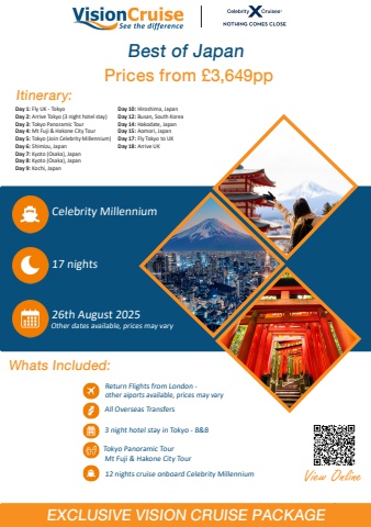 Watch us LIVE or on Demand at www.visioncruise.co.uk/tv 13Other dates available, prices may varyEXCLUSIVE VISION CRUISE PACKAGE Best of JapanCelebrity Millennium17 nights26th August 2025Prices from %u00a33,649ppItinerary:View OnlineWhats Included:Return Flights from London - other aiports available, prices may varyAll Overseas Transfers3 night hotel stay in Tokyo - B&BTokyo Panoramic TourMt Fuji & Hakone City Tour12 nights cruise onboard Celebrity MillenniumDay 1: Fly UK - TokyoDay 2: Arrive Tokyo (3 night hotel stay)Day 3: Tokyo Panoramic TourDay 4: Mt Fuji & Hakone City TourDay 5: Tokyo (Join Celebrity Millennium)Day 6: Shimizu, JapanDay 7: Kyoto (Osaka), JapanDay 8: Kyoto (Osaka), JapanDay 9: Kochi, Japan Day 10: Hiroshima, JapanDay 12: Busan, South KoreaDay 14: Hakodate, JapanDay 15: Aomori, JapanDay 17: Fly Tokyo to UKDay 18: Arrive UK