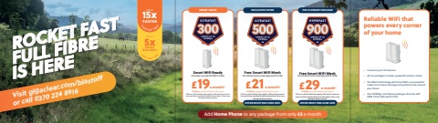 ROCKET FAST FULL FIBRE IS HEREReliable WiFi that powers every corner of your home%u2022 Connect up to 100 devices. %u2022 All our packages include a powerful Linksys router.%u2022 The Mesh technology with Smart WiFi uses powerful nodes to increase coverage and performance around your home.%u2022 Our 500Mbps and above packages all come with Visit gigaclear.com/blastoffFREE Smart WiFi worth %u00a3108.or call 0370 224 8916 Add Home Phone to any package from only %u00a35 a monthGREAT VALUE EXCLUSIVE OFFER OFFER MUST END JUNE 30th OFFER MUST END JUNE 30thTHE ULTIMATE PACKAGE%u00a319a month*300Mbps avg upload/download speed%u00a330 one-off activation fee applies. 18/month minimum term and then standard list price thereafter. Prices may change during contract.Smart WiFi Ready Includes a powerful WiFi router%u00a321 a month*469Mbps avg upload/download speed%u00a330 one-off activation fee applies. 18/month minimum term and then standard list price thereafter. Prices may change during contract.Free Smart WiFi Meshfor whole home coverage worth %u00a3108%u00a329 a month*900Mbps avg upload/download speed%u00a330 one-off activation fee applies. 18/month minimum term and then standard list price thereafter. Prices may change during contract.Free Smart WiFi Meshfor whole home coverage worth %u00a3108THAN PART FIBRE15xFASTERTHAN PART FIBRE5xMORERELIABLEUP TOUP TO