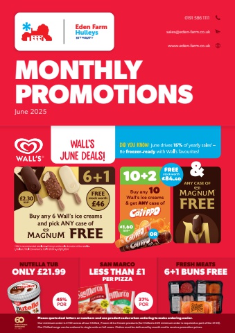 Eden FarmHulleys0191 586 1111sales@eden-farm.co.ukwww.eden-farm.co.ukMONTHLYPROMOTIONSJune 2025Please quote deal letters or numbers and use product codes when ordering to make ordering easier.Our minimum order is %u00a3150 across all our Chilled, Frozen & Ice Cream products (for Chilled a %u00a325 minimum order is required as part of the %u00a3150). Our Chilled range can be ordered in single units or full cases. Orders must be delivered by month end to receive promotion prices. FRESH MEATS6+1 BUNS FREE45% PORNUTELLA TUBONLY %u00a321.9937% PORSAN MARCOLESS THAN %u00a31PER PIZZA