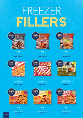 16FILLERSFREEZER2903American RanchBBQ Wings12x500g RRP: %u00a33.50Only %u00a328.9931%POR2957American RanchHot & Spicy Wings12x500g RRP: %u00a33.50Only %u00a328.9931%POR2904American RanchCrunchy Wings10x500g RRP: %u00a33.99Only %u00a327.4931%POR3143Bannisters Farm2 Baked Jacket Potatoes %u00a32.398x400g RRP: %u00a32.39Only %u00a311.9937%POR2392SFCBoneless Chicken Box6x500g RRP: %u00a34.15Only %u00a317.9928%POR7957SFCChicken Nuggets %u00a31.0014x170g RRP: %u00a31.00Only %u00a310.0529%POR3814Street ShackLoaded Cheesy Fries %u00a32.758x250g RRP: %u00a32.75Only %u00a315.4930%POR3815Street ShackLoaded Mac 'N' Cheese %u00a32.758x300g RRP: %u00a32.75Only %u00a315.4930%POR3782Street ShackLoaded Spicy Fries %u00a32.508x250g RRP: %u00a32.50Only %u00a314.0930%POR