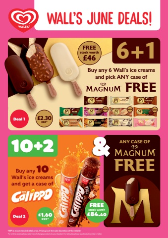Wall's Impulse 1NEW NEW NEWWall%u2019s JUNE DEals!6+1%u00a32.30RRP*FREEstock worth%u00a346*RRP is recommended retail price. Pricing is at the sole discretion of the retailer.Buy any 6 Wall%u2019s ice creams and pick ANY case ofFREEFREEANY CASE OF%u00a31.60RRP*FREEstock worth%u00a384.4010+2Buy any 10Wall%u2019s ice creamsand get a case ofFor online orders please add free of charge products to your basket. For telesales please quote deal number / letter.Deal 1Deal 2
