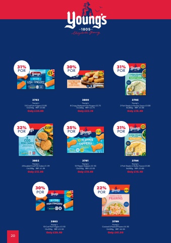 203795Young's2 Fish Steaks in Parsley Sauce %u00a33.008x280g RRP: %u00a33.00Only %u00a316.4931%POR3793Young's10 Cod Fish Fingers %u00a33.0012x250g RRP: %u00a33.00Only %u00a324.9931%POR3800Young's8 Crispy Battered Fish Fingers %u00a32.7512x240g RRP: %u00a32.75Only %u00a323.1930%POR31%POR32%POR3794Young's2 Fish Steaks in Butter Sauce %u00a33.008x280g RRP: %u00a33.00Only %u00a316.493802Young's4 Breaded Cod Fish Cakes %u00a31.5912x200g RRP: %u00a31.59Only %u00a312.993791Young's10 Flipper Dippers %u00a32.5012x250g RRP: %u00a32.50Only %u00a319.4935%POR3799Young'sCooked & Peeled Prawns %u00a34.5012x180g RRP: %u00a34.50Only %u00a341.9922%POR3803Young's10 Cod Fish Fingers %u00a33.5012x250g RRP: %u00a33.50Only %u00a329.4930%POR